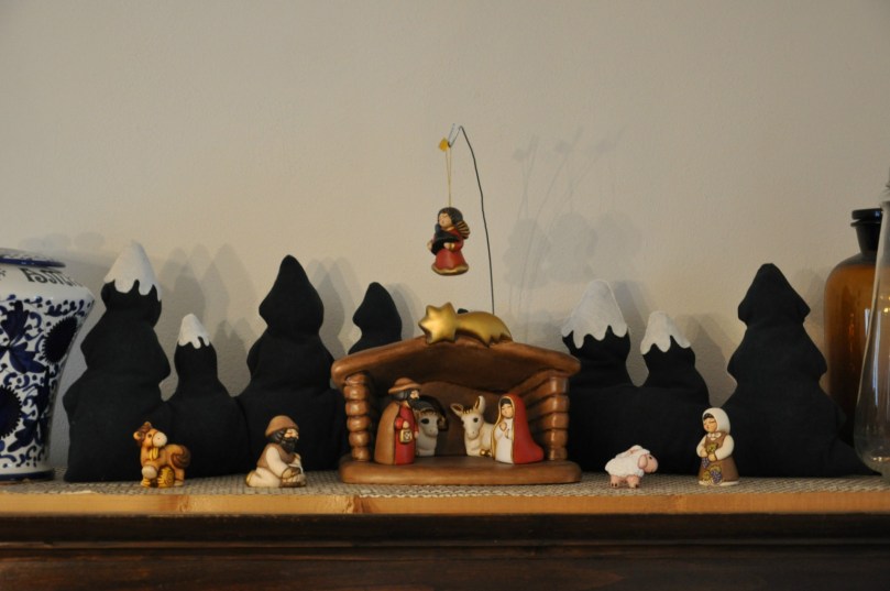 Abbiamo anche trovato un posto per il presepe che lo tenesse al riparo dalle zampette e dal naso curioso di Rusty! I pini innevati che ho fatto lo scorso anno si prestano ancora come sfondo.
