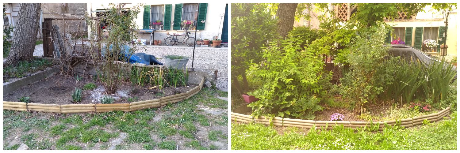 Per scrivere questo post ho ripreso le foto del giardino com’era per ricordarmi da dove siamo partiti. Avevamo il cortile in cemento completamente rovinato, una parte di prato recintato, con la rete collassata ed erbacce mai viste.. Praticamente niente fiori, ma noci, noccioli, un ciliegio, un fico, l’alloro e una giovane pianta di glicine abbandonata. C’erano vasi vuoti, potenzialità e voglia di fare..