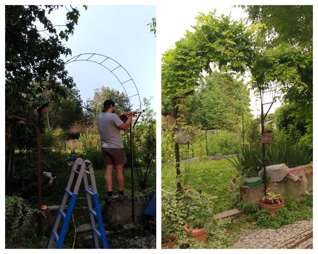 Abbiamo costruito la pergola per il glicine, per far in modo che abbia uno sfogo diverso dalle altre piante.. Abbiamo deciso di far correre il gelsomino attorno alla porta d’ingresso (e costruito il supporto per poterlo fare) ci siamo fatti portare vasi, terra a fiori dai fioristi che potevano lavorare..