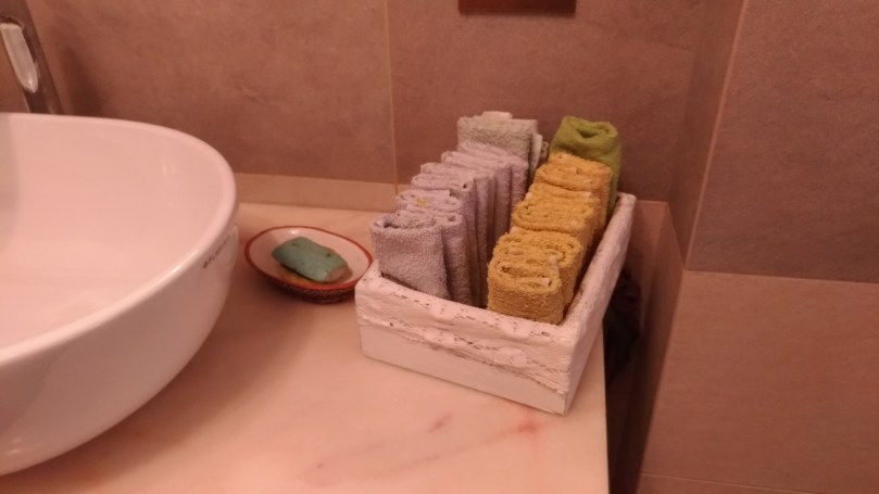 Una volta realizzate le vostre lavette dovrete solo trovare un modo carino per disporle nel bagno degli ospiti. Io ho pensato di riciclare una scatola di legno che ho trovato a casa della nonna.