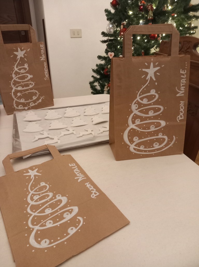 Come gli anni scorsi sono partita dai sacchetti avana con i manici e li ho decorati con i pennarelli bianchi a vernice. Ogni anno un soggetto diverso. Lo so è solo una piccolissima cosa, ma portare avanti una tradizione di anno in anno mi piace 🙂