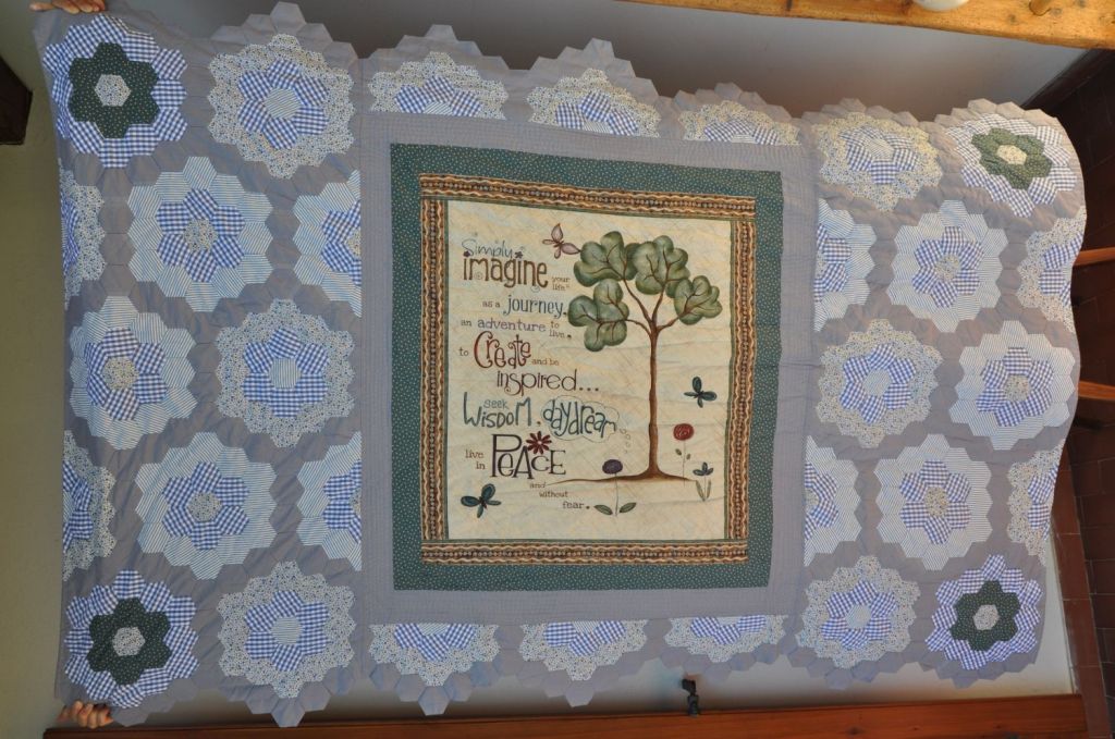 Una volta definito il disegno ed assemblati gli esagoni il procedimento è quello classico, imbottitura, retro e poi si borda il tutto. Io ho scelto di finire la coperta non dritta ma seguendo la linea degli esagoni.