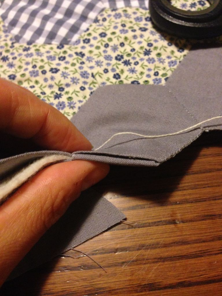 Il processo in se è semplice, si taglia la stoffa della dimensione dell’ esagono più un margine comodo di cucitura, si sistema l’esagono sulla stoffa e si ripiegano i bordi fissandoli con un filo da imbastitura sull’esagono stesso. Poi si procede cuocendo gli esagoni tra loro. Tutti questi passaggi sono cuciti a mano.