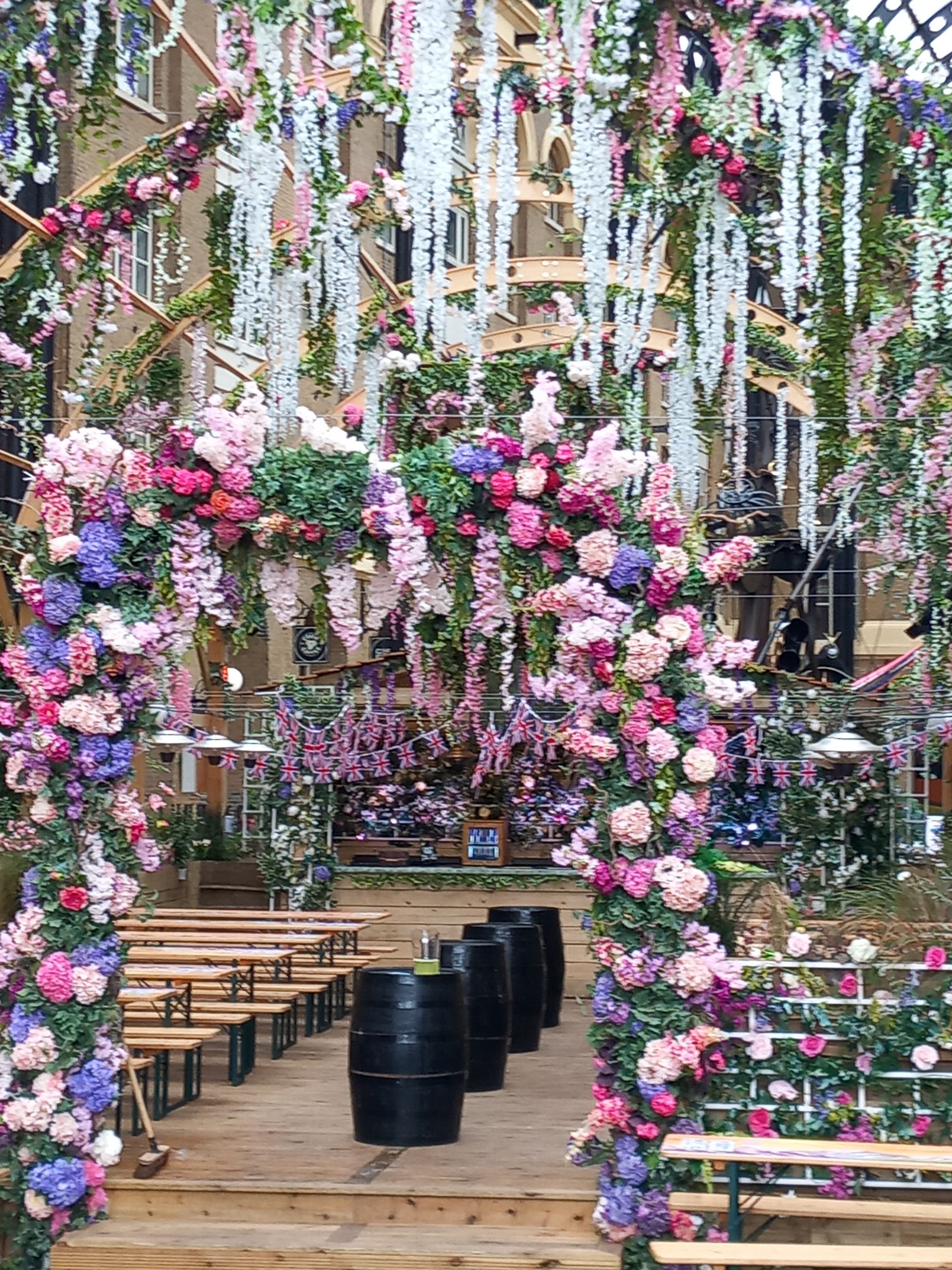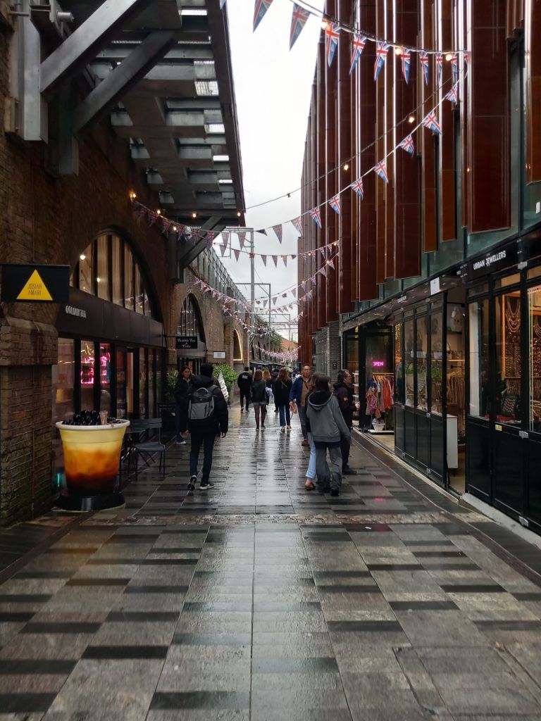 Here we are, in a festively decorated London, among flags and flowers, under an inevitable English drizzle..