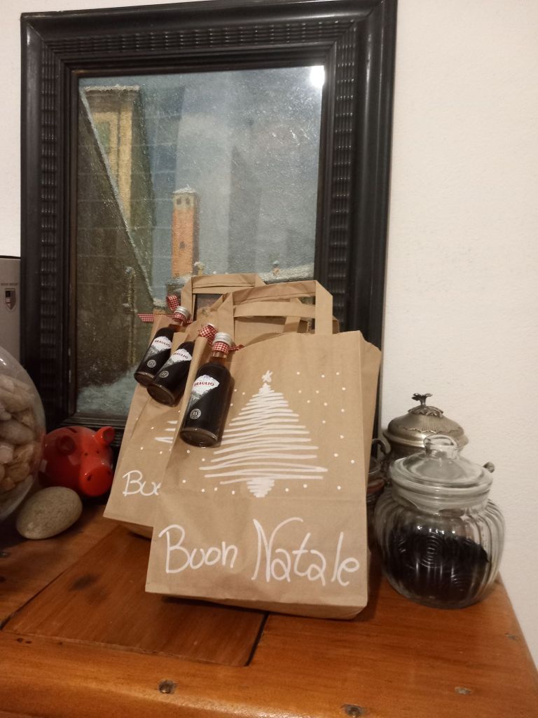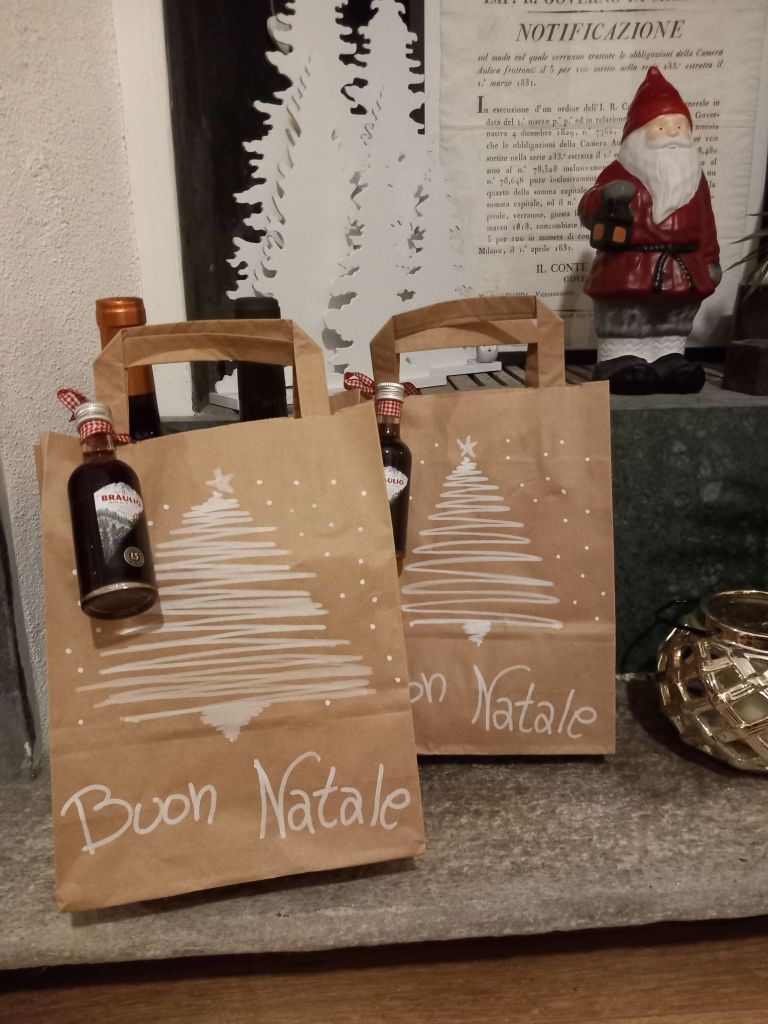 Quindi eccoli qui i sacchetti di quest’anno. I miei preferiti rimangono quelli del 2021… Di quest’anno amo le mini bottiglie di “Braulio” che trovo adorabili.