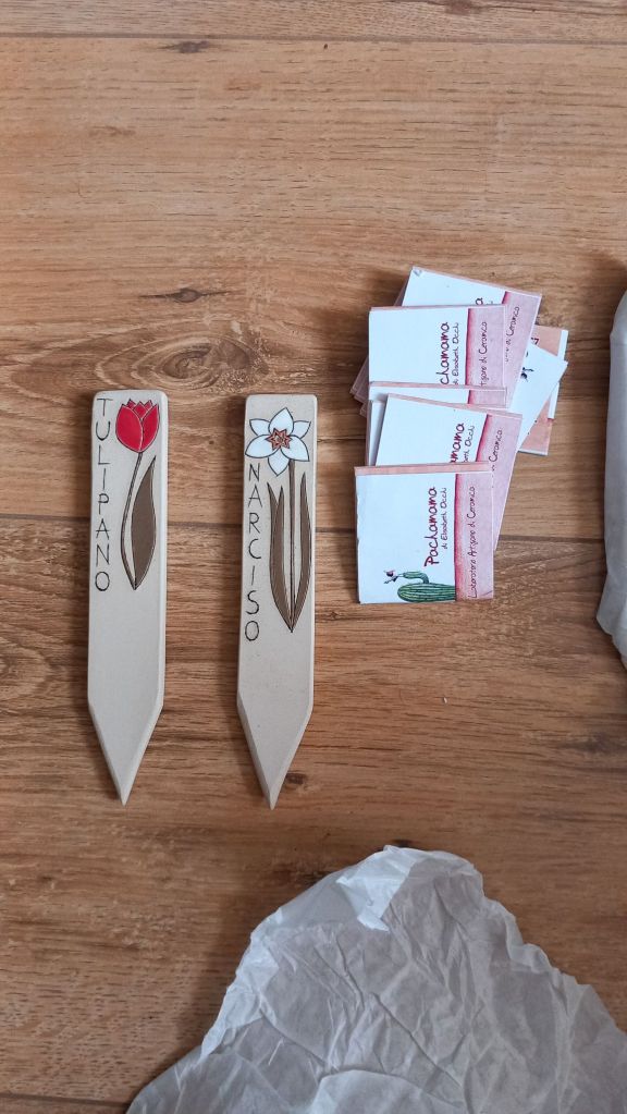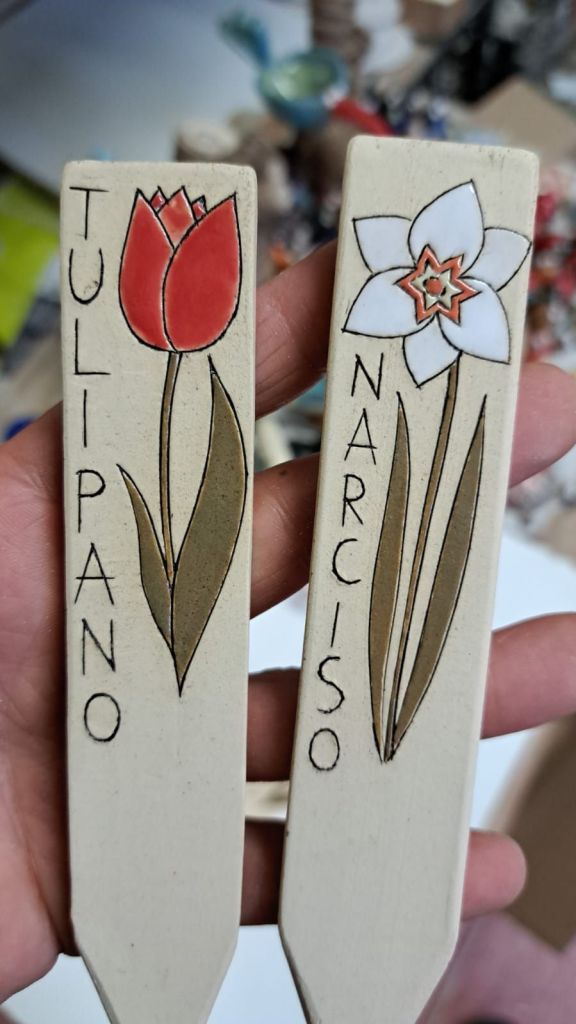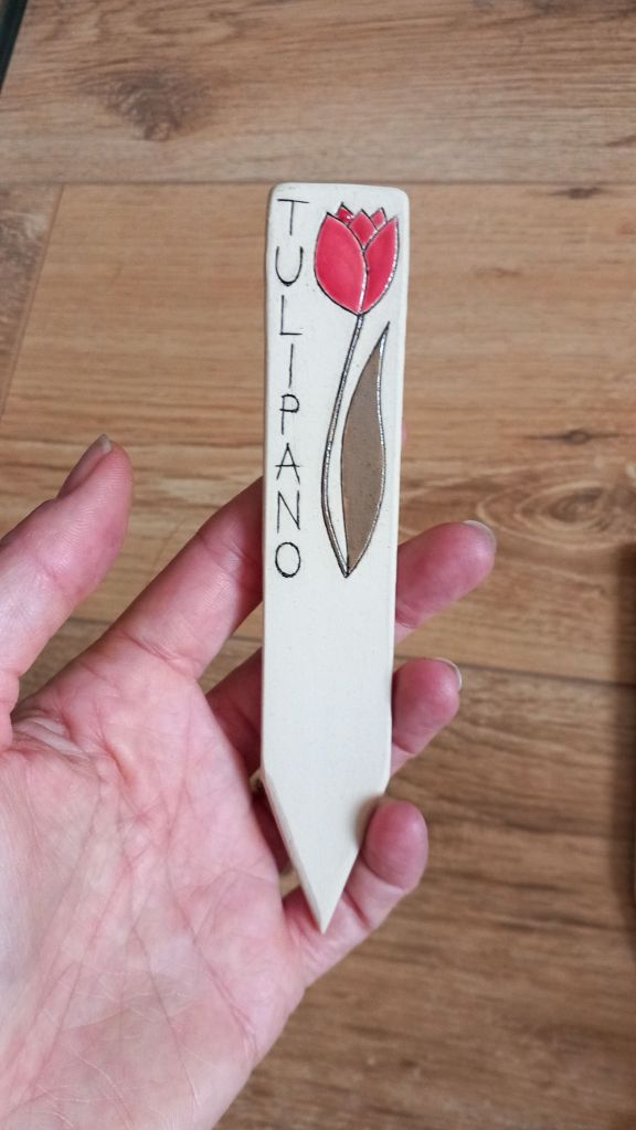 Lo scorso anno avevo regalato dei bulbi di tulipano, quest’anno ho pensato di far realizzare delle targhette per il giardino per quegli stessi tulipani..
