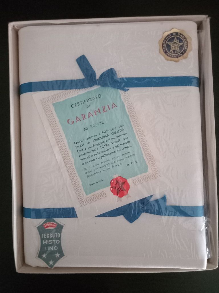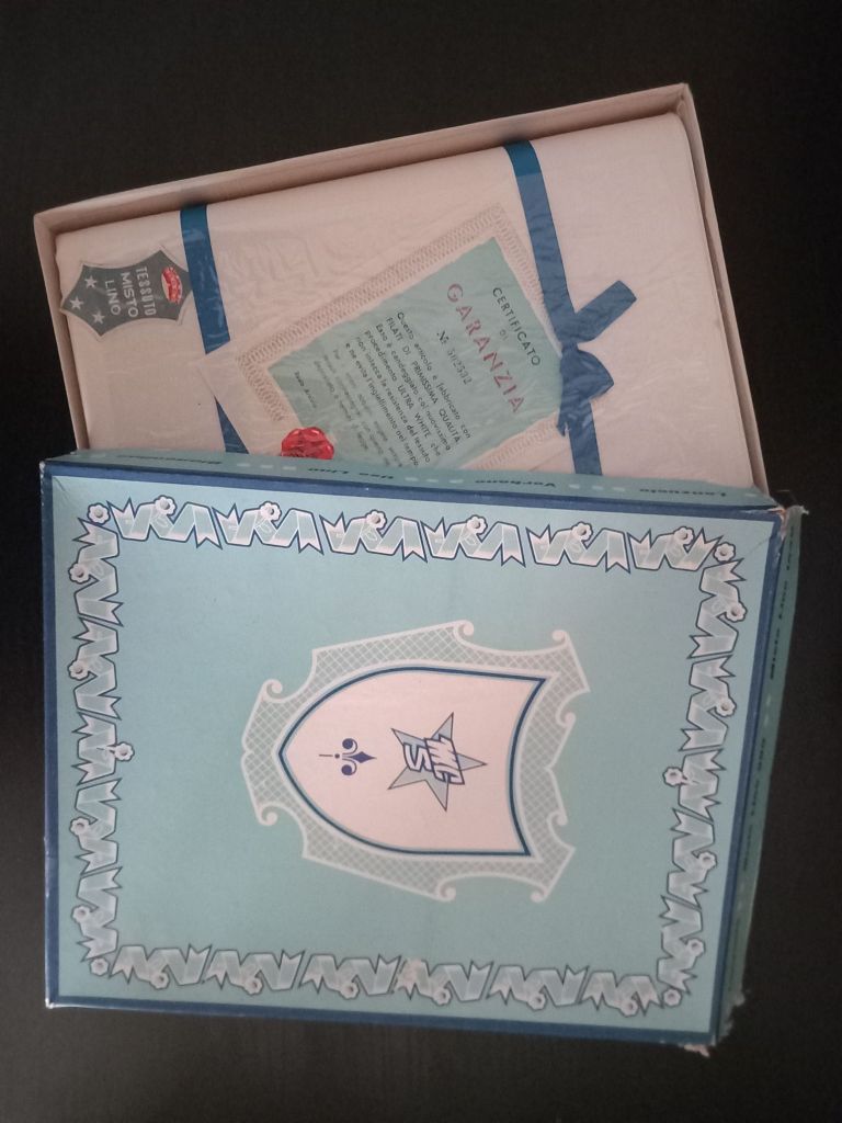 Vi avevo detto che “casa della nonna” sarebbe stata un soggetto ricorrente nei post, non immaginavo così presto però. Tra le varie cose riemerse dagli armadi, ancora all’interno della scatola originale, ho trovato questo lenzuolo matrimoniale di lino bianco.