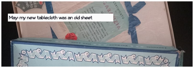I told you that “grandma’s house” would be a recurring theme in the posts, but I didn’t imagine it would be so soon. Among the various things that emerged from the closets, still in their original box, I found this white linen double-size sheet.